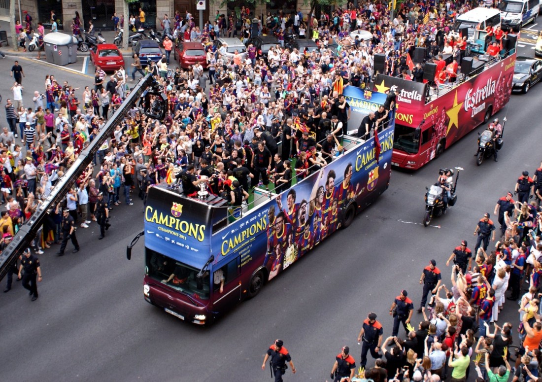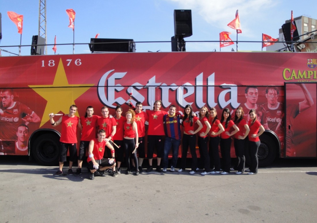 Autobús animación Rúa celebración FCBarcelona (2011, 2011, 2013). Contratación autobús, equipo de sonido, técnicos, grupos electrógenos, batucada, cheer-leaders, confetti, uniformes.